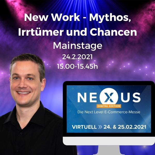 Ein Vortrag auf einer Veranstaltung ist immer etwas Besonderes. In Coronazeiten natürlich noch umso mehr. Ich habe mich über die Einladung für einen Vortrag auf der digitalen NEXUS Messe am 24.2.2021 wirklich gefreut. Der Titel meines Vortrags lautete „New Work – Mythos, Irrtümer und Chancen“ und war natürlich etwas provokant formuliert. Es ging um die differenzierte Betrachtung eines Mode/Buzzwords.